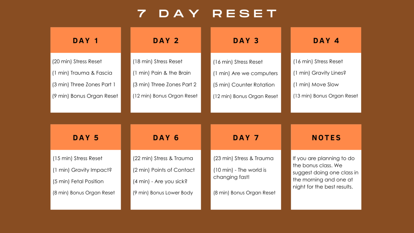 For this next 7 days we are going to test you, and see how committed you are to resetting your life. We are going to guide you through seven days of fascial maneuvers and basic education about your body, including how to replenish your body with the vital nutrients that it needs to function optimally.