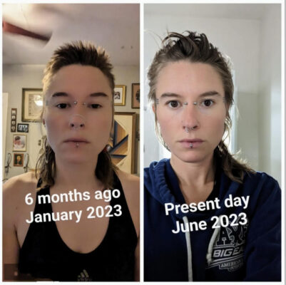 “I found the Human Garage and started off with their one day reset, I graduated to all their resets. I felt called to complete all of them, 6 months later I’m in their lifestyle artist program and it has changed my life and my perception. I struggled with loads of anxiety, worry, doubt, fear. Since starting fascial maneuvers I have found inner standing and wholeness within myself. I’ve learned pain is not something to fear. I’ve learned the body speaks and if you listen it will guide you in the right step. Here is a picture of my progress in time. My eyes aren’t as sunk in, my face is symmetrical, my jaw has widened and my face is no longer swollen like it was. This program changed my life, and it can change and transform yours, too (…) Love you!”